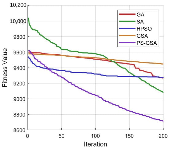 The convergence curve for PS-GSA exhibits a slight downward trend at the end of 200 iterations, indicating that marginal improvements could be possible with an extended run. However, the rate of convergence has slowed significantly, suggesting the algorithm is approaching the optimal solution region. Therefore, the 200-iteration limit is established as a reasonable trade-off between solution quality and computational cost.