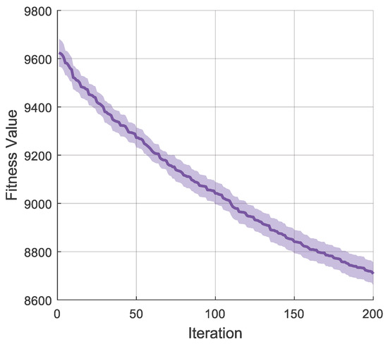 The convergence and stability of the algorithm will be analyzed below. Figure 3 illustrates the average convergence performance of the five algorithms over 200 iterations for the largest instance (). The y-axis represents the average fitness value, while the x-axis represents the iteration number.
