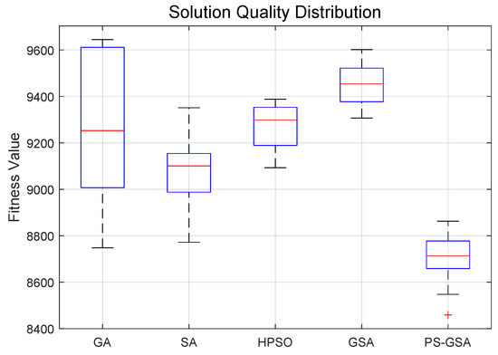 Figure 5 provides a clear visual summary of both the solution quality and stability of the algorithms. The PS-GSA box plot is positioned lowest on the y-axis, confirming that it achieves the best median fitness value. More importantly, the interquartile range, represented by the height of the box, is notably compact for PS-GSA. This shows that the middle 50% of its solutions are tightly clustered around the median. In contrast, the box plots for GA and SA are much taller and have longer whiskers, signifying a high variability in their outcomes. This high variance makes them less reliable, as a single run could yield either a good or a poor result. The performance of PS-GSA is evidenced by its low standard deviation (Table 9) and tight interquartile range. The global guidance from the PSO framework reduces the likelihood of the search deviating into poor regions of the solution space, while the VNS and SA components ensure thorough exploitation of promising areas.
