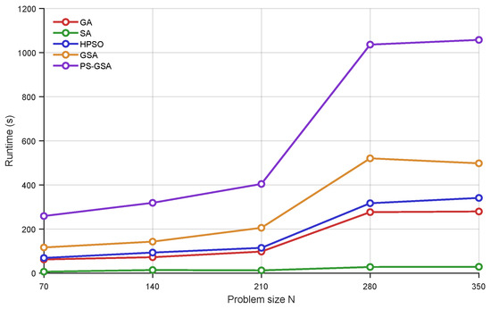 The analysis of computational time reveals that the proposed PS-GSA is the most computationally intensive algorithm among the tested set. As shown in Figure 6, its runtime increases substantially with problem size, reaching approximately 1058 s for the largest instance (). In contrast, SA is the fastest, requiring only approximately 29 s for the same instance. However, this higher runtime should be interpreted not as a weakness but as a justified trade-off for achieving superior solution quality. This higher computational cost is an inherent and expected consequence of PS-GSA’s architectural complexity. The additional time is consumed by the sophisticated operators that simpler algorithms lack: calculating the discrete PSO swap sequences, performing the systematic VNS local searches, and executing the iterative logic of the SA acceptance criterion.