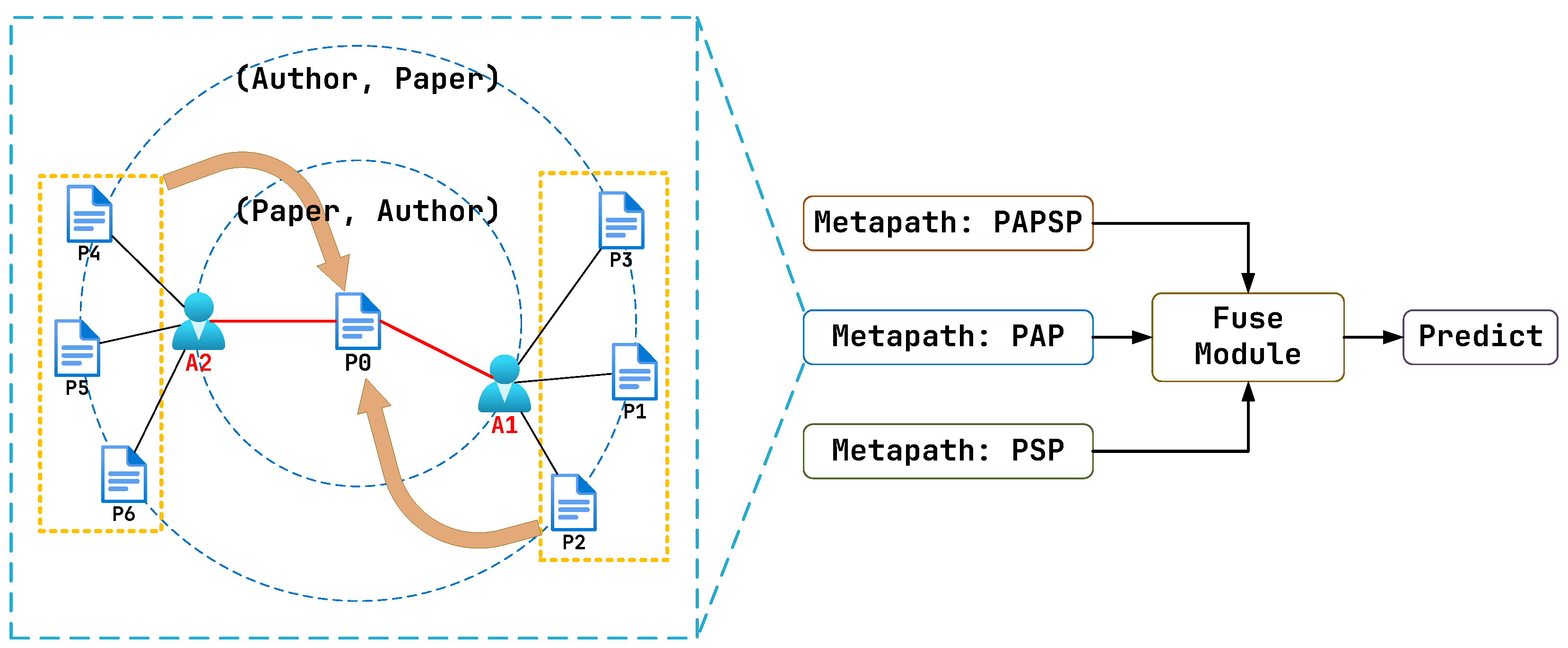 Much real-world data can be effectively represented as Heterogeneous Graphs (HeteGs). In contrast to homogeneous graphs, HeteGs encompass multiple types of nodes and edges, each conveying rich information and forming a complex topological structure. Motivated by the need to analyze such data, various well-performing Heterogeneous Graph Neural Networks (HeteGNNs) have been proposed [44,45]. HeteGNNs often adopt a metapath-centric framework to integrate the diverse attributes inherent in HeteGs. The core concept involves utilizing metapaths to semantically aggregate nodes that are distantly located from each other [44]. For example, as shown in Figure 1, with the metapath paper-author-paper, paper-typed node-P0 and {P4,5,6} can be viewed as neighbors directly while ignoring author-typed node-A2. Unlike traditional GNNs, which directly aggregate messages from adjacent nodes, most HeteGNNs employ a concept known as metapaths.