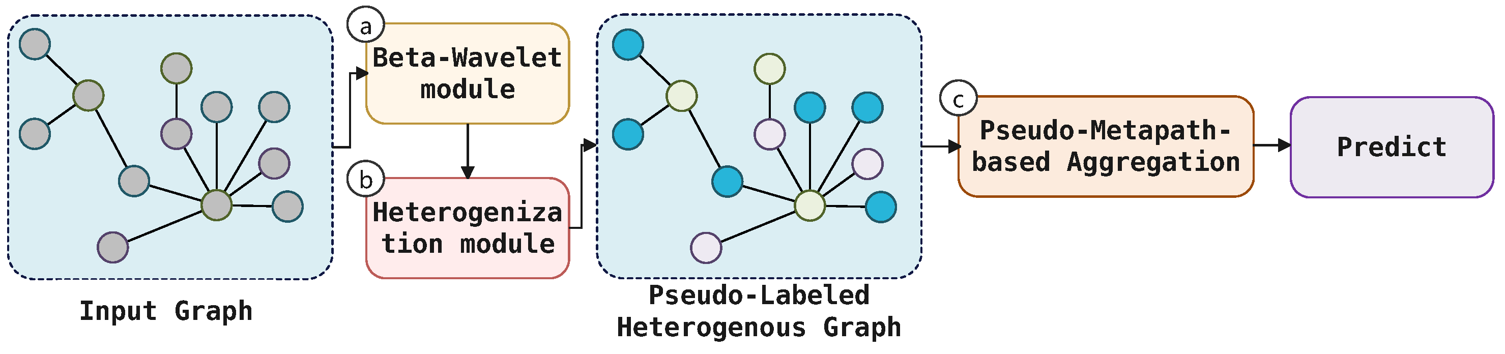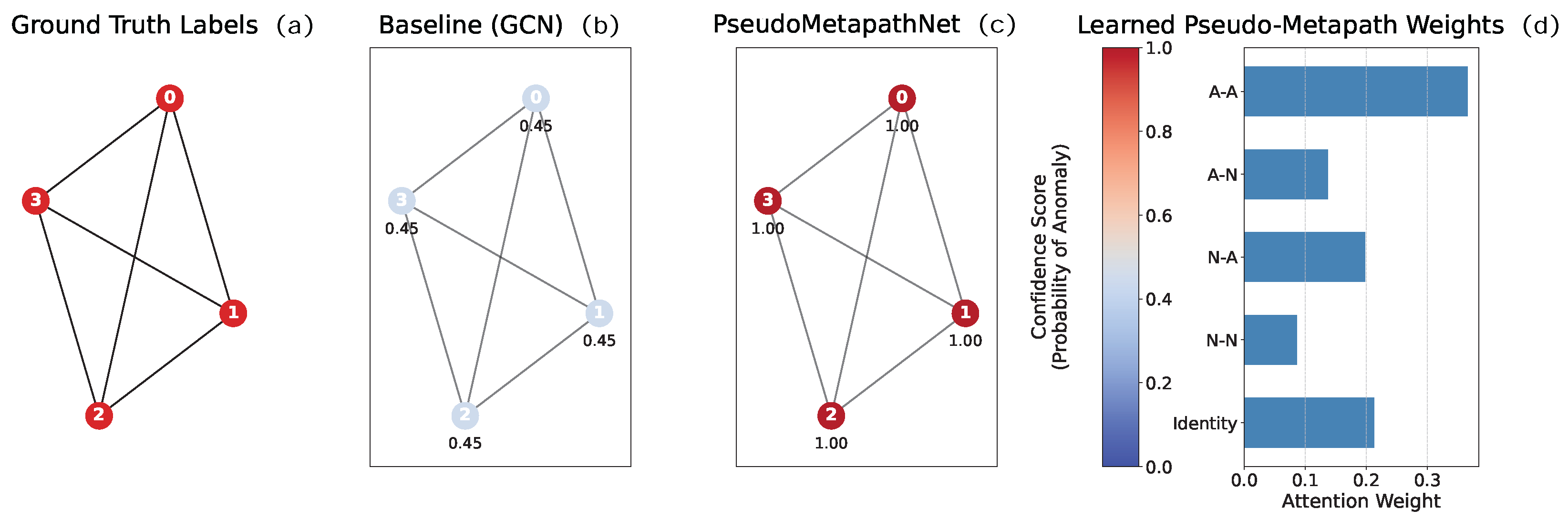 We address this gap by introducing Pseudo-Metapaths: dynamic, semantically aware propagation routes discovered on-the-fly. Our framework begins by using Beta-Wavelet spectral filtering to extract high-frequency components indicative of anomalies, producing robust initial node embeddings that are resilient to heterophily and local noise. The core of our innovation lies in then transforming the graph into a transiently heterogeneous structure. At each training epoch, we assign temporary “normal” or “anomaly” types to nodes using the model’s own pseudo-labels. This transformation enables an attention mechanism to automatically learn which Pseudo-Metapaths (e.g., ‘Anomaly–Normal–Anomaly‘) are most effective for conveying supervisory signals. By coupling high-frequency spectral cues with dynamic metapath attention, our framework delivers label information across semantically promising—not merely topologically adjacent—regions of the network, directly combating the under-reaching problem.