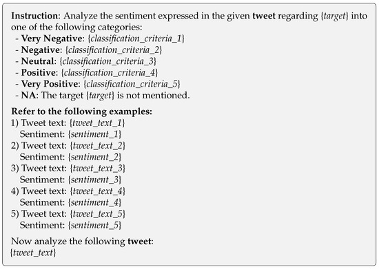 For each tweet to be classified, five of the most semantically similar examples were retrieved from the demonstration pool using cosine similarity over SBERT embeddings [38]. These examples, along with the classification schema, were included in a unified prompt format. The final prompt template is shown in Figure 1.