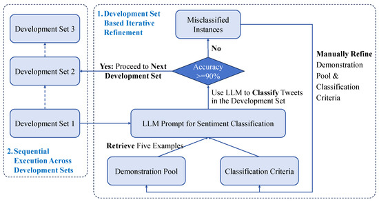 Accordingly, we designed an LLM-based strategy to automate sentiment labeling, employing GPT-4.1 (https://openai.com/index/gpt-4-1/ (accessed on 15 June 2025) ) as the underlying model. To ensure alignment between LLM-generated labels and human judgment, we implemented two complementary procedures: (1) Few-Shot In-Context Learning with Manual Annotations (Section 3.3.1); and (2) Iterative Refinement via Human-in-the-Loop Evaluation (Section 3.3.2).