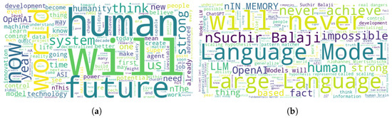 Word clouds generated from tweets in the AGI dataset with “Mildly Negative,” “Neutral,” and “Mildly Positive” sentiments: (a) tweets labeled as “Mildly Negative”; (b) tweets labeled as “Neutral”; (c) tweets labeled as “Mildly Positive.” The size of each word reflects its relative frequency within the corresponding sentiment class.