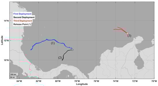 On 7 July 2024, with the support of an oceanographic vessel of the Colombian Navy, five drifters were deployed at the position shown in Figure 1. The same procedure was subsequently repeated at another location. Based on these deployments, the Lyapunov exponents were calculated in order to run the direct model (2)–(6) multiple times, varying the parameters a and W over a range of real values. The buoy data were processed in such a way that the vector of currents was extracted, which in the model is defined by the combination of surface currents and Stokes drift obtained from the Copernicus platform [21]. The residual from this extraction corresponds to turbulent pulsations experienced by the drifters.