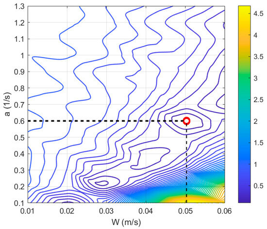 Contours of as a function of parameters a and W, according to the methodology described in Section 2.2.2. The minimum of ε (red circle) is demonstrated for the parameters a = 0.6 s−1 and W = 0.05 m s−1.
