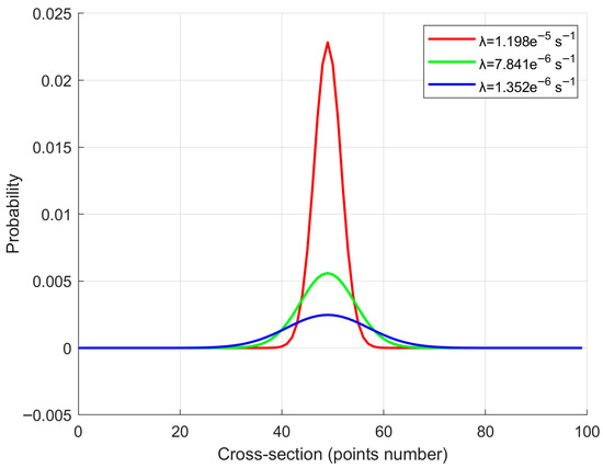 The process of varying the error functional was carried out using the drifter data, comparing the areas under the probabilistic curve P(x,y,T), and the minimum of this value was identified, as shown in Figure 2, thereby characterizing the fundamental values of a and W. Figure 3 presents the shape of the initial distribution of the search area for different values of the Lyapunov exponent.