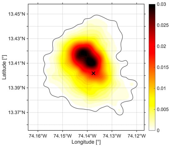 - With the deployment of the two drifters, it was possible to conduct the complete procedure defined in Section 2.2.1, Section 2.2.3 and Section 2.2.4. The parameters a and W were adjusted using Equation (18), and the probabilistic search area was obtained, like that shown in Figure 3. From this area, the model was run, where the deterministic component consisted of the sum of surface current vectors and Stokes drift, provided by the Mercator operational forecasting system with hourly temporal discretization. Wind-induced leeway was not considered, as it is not relevant for a person in the water.