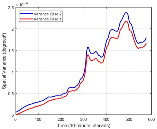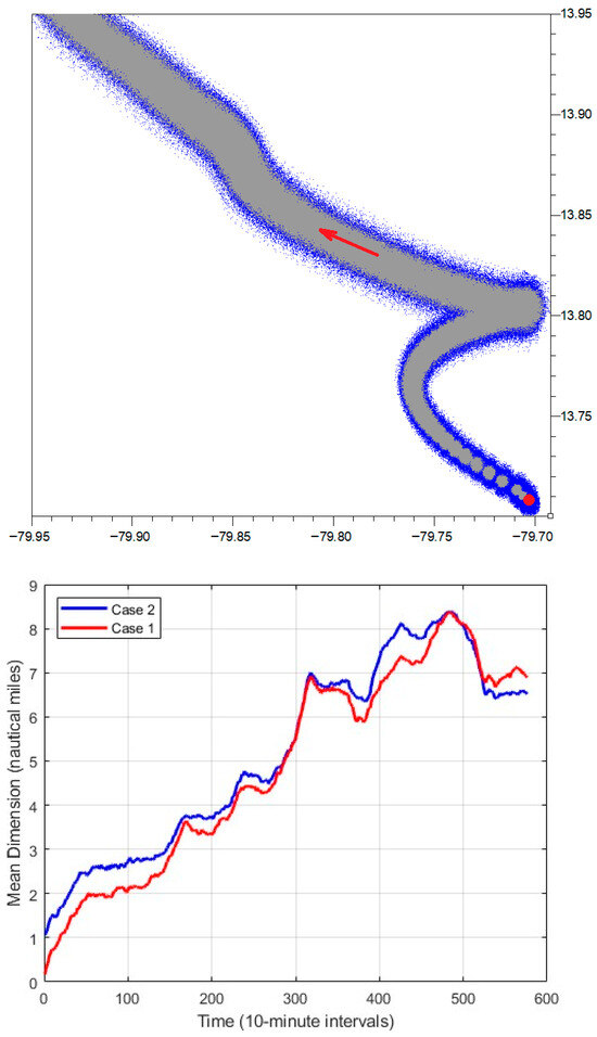 (Top): Fragment of the trajectories of an object at sea, originating from a single point (red point, gray trajectory) and from a finite initial probabilistic area (blue trajectory). (Middle): Mean dimensions of the probabilistic areas along the respective trajectories. (Bottom): Spatial variance as a function of time. Case 1: single initial point; Case 2: finite initial area, computed using the proposed model.