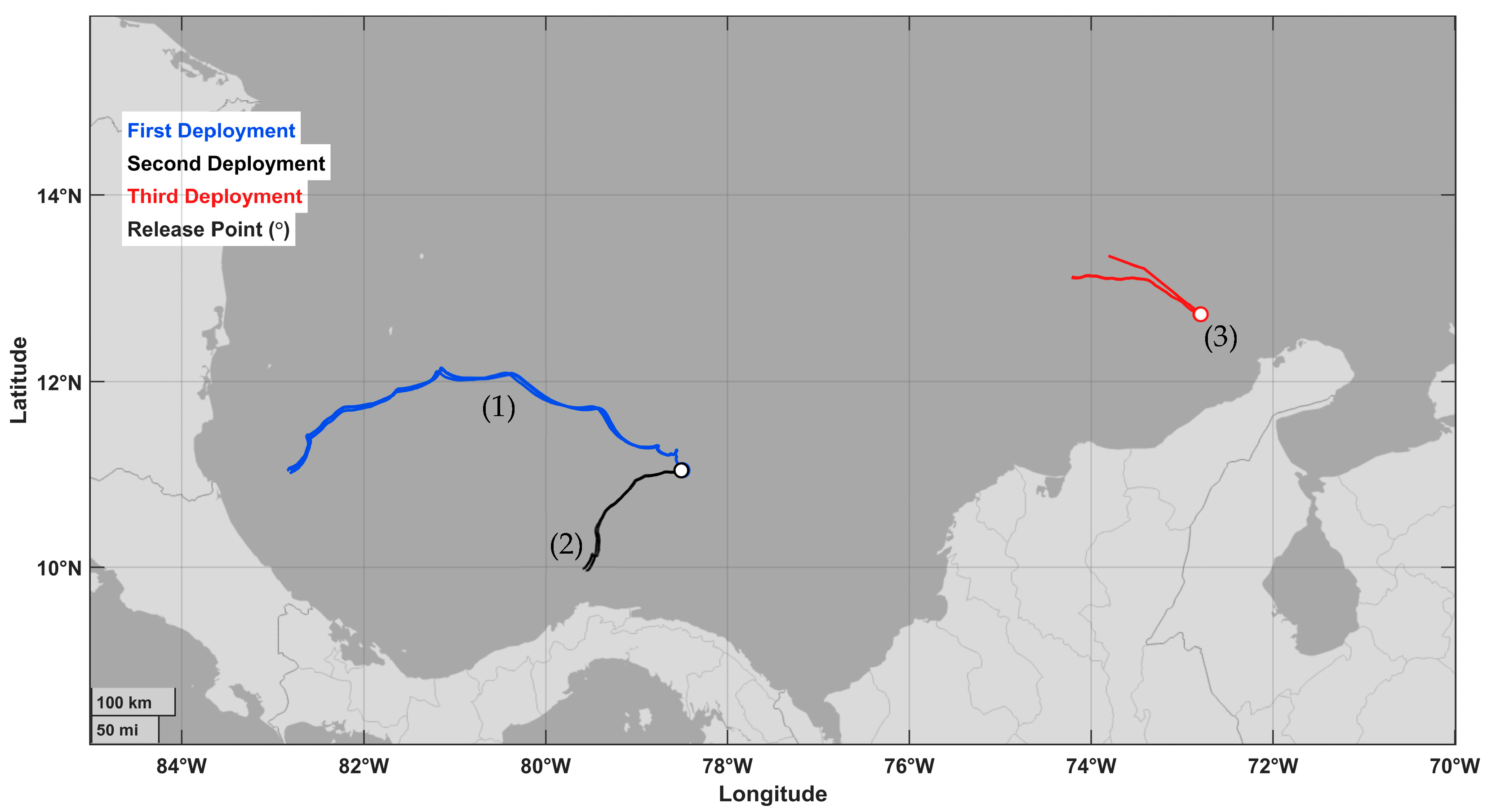 To examine how the initial probability fields affect the forecast outcome as compared to a single initial search point, it was necessary to conduct an additional experiment with tracers released at different coordinates in the Caribbean Sea.