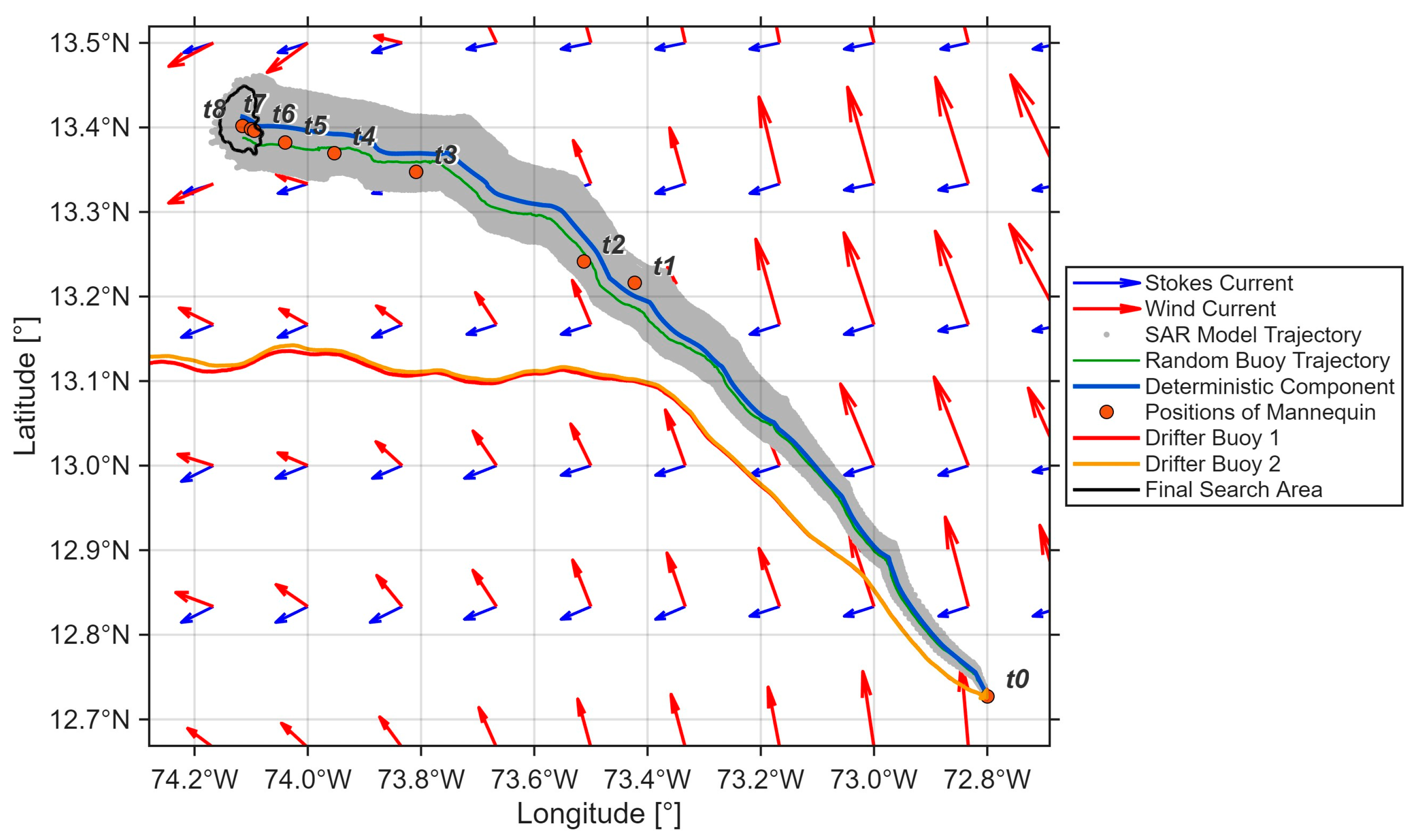 In this context, one of the relevant precedents for search and rescue operations at sea is the Computer-Assisted Search Program (CASP), developed by the United States Coast Guard. CASP utilized Monte Carlo methods to generate probability distributions, thereby producing a set of particle trajectories. This was performed to estimate the object’s location as a function of time. However, it should be noted that the initial datum was not subject to error or uncertainty [