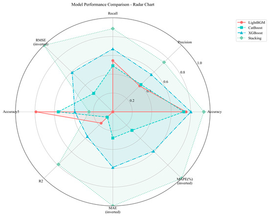 As shown in Table 5 and Figure 3, the Stacking fusion model achieved superior performance across all key metrics. It attained an Accuracy5 of 0.674, a Precision of 0.649, and a Recall of 0.677, outperforming each individual benchmark algorithm. Furthermore, the model’s R2 value reached 0.679, indicating a significantly better goodness-of-fit compared to the single models (LightGBM: 0.617, XGBoost: 0.637, CatBoost: 0.608). Concurrently, the RMSE was reduced to 214.59, which represents a 16.6% improvement over the second-best model (XGBoost). These results collectively demonstrate the higher predictive accuracy of the proposed Stacking framework.