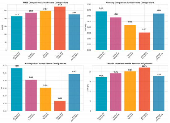 As illustrated in Figure 4, the configuration “Without Categorical” features, for example, shows that the RMSE increased from 214.1 to 236.6, while the R2 value decreased from 0.690 to 0.606. These results further confirm the performance degradation and highlight the crucial role of categorical feature encoding in demand forecasting accuracy.