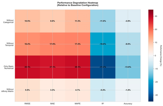 Figure 5 displays a heatmap of the relative performance degradation, illustrating the percentage changes in other configurations compared to the baseline. Shades of red indicate performance deterioration, whereas shades of blue represent performance improvement. The most pronounced performance decline is observed in the configurations excluding categorical features and using only basic numerical features. The heatmap clearly indicates that temporal features represent the second most critical feature category, with an average performance drop of 17% across all metrics. This finding aligns with the time-series nature of demand forecasting. Meanwhile, the removal of the affinity matrix resulted in the mildest performance impact (average decrease of 5.1%), suggesting that although cross-product relationships help improve prediction accuracy, their absence can be partially compensated by other feature types in the Stacking framework.