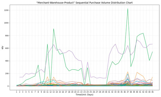For each merchant-warehouse-product combination, daily data were analyzed. The investigation revealed the emergence of new product types within specific merchant-warehouse pairs. The visualized demand trends over time are presented in Figure 6, where each curve represents a unique warehouse-product sequence. Notably, the sequences exhibit convergent trend patterns.