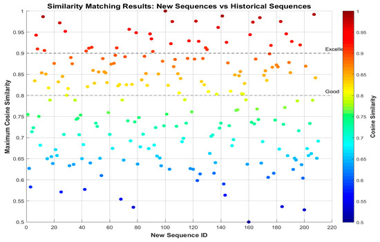 The experimental results indicate that by calculating the cosine similarity between the forecasted and actual sequence vectors, the historical sequence with the highest similarity to the forecast period can be identified. A scatter plot of these similarity matching results is shown in Figure 7. The plot clearly demonstrates that the cosine similarity values approach 1, indicating strong alignment between the sequences. For optimal matching, historical sequences temporally proximate to the forecast period were prioritized, showing consistent demand patterns. After removing redundant sequences, the feature vectors retained displayed a highly concentrated distribution of similarity scores, further corroborating the effectiveness of the proposed model in capturing seasonal variations.