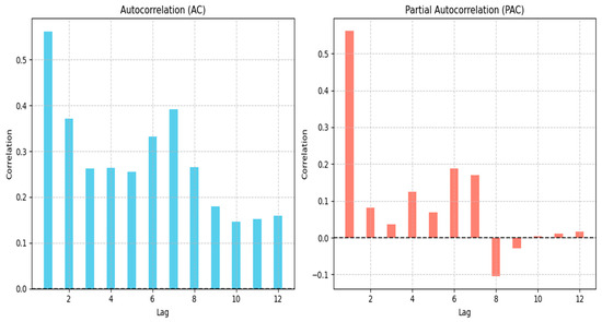 Given the extensive volume of data, this section presents the validation results for a representative case: Product 430 in Warehouse 23 belonging to Merchant 19. The autocorrelation function (AC) and partial autocorrelation function (PAC) plots against the lag order are shown in Figure 8 and Table 8, respectively.