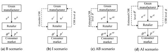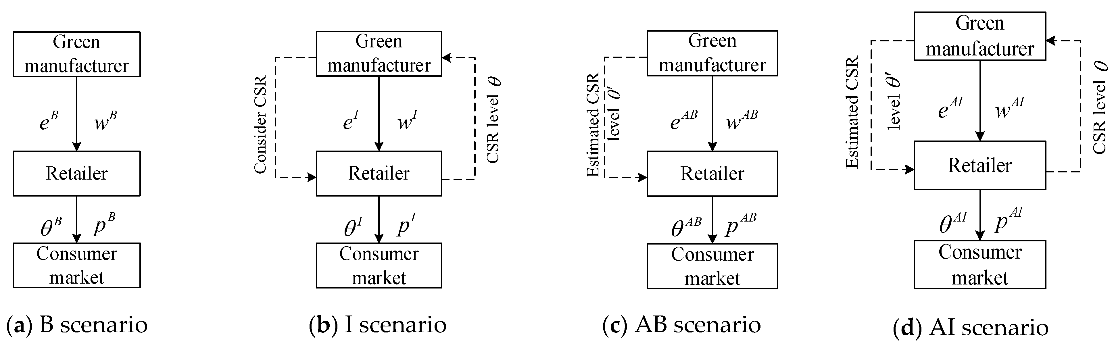 To address these research gaps, we take a two-echelon green supply chain as the research object. Considering demand uncertainty, the comparison of the manufacturer’s estimated CSR degree with the retailer’s actual CSR degree is innovatively taken as the expression of information asymmetry. Using game-theoretic modeling, four models of information symmetry without retailer CSR implementation (Model B), information symmetry with retailer CSR implementation (Model I), information asymmetry without retailer CSR implementation (Model AB), and information asymmetry with retailer CSR implementation (Model AI) are constructed. By comparing the retailer’s profit maximization and utility maximization, this paper studies the CSR behavior mechanism of the retailer under different information conditions. Furthermore, we also explore the respective revenue changes of both members in different scenarios and obtain the optimal strategy selections of the retailer in different environments.