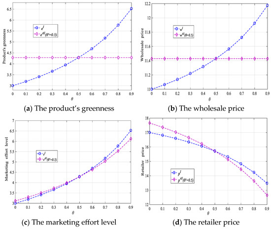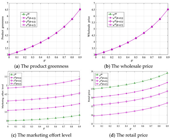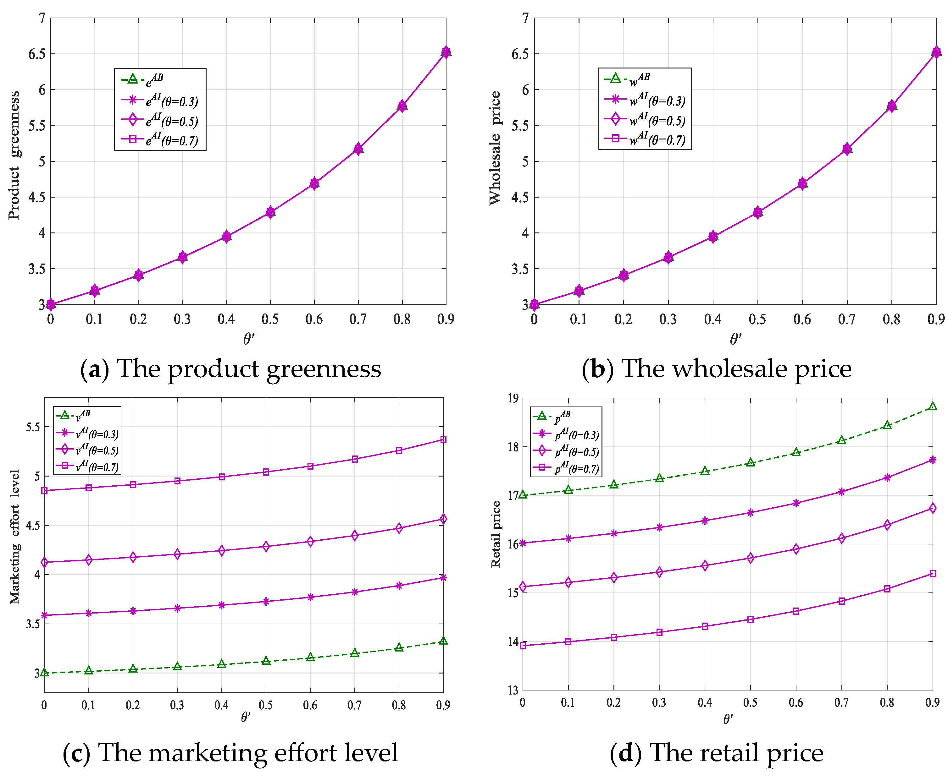) of the retailer, compared with Scenario I, the greenness of products, wholesale prices, green marketing investment, and retail prices in the AI scenario will all be higher. The manufacturer’s reinforced decision-making stems from an overestimation of the retailer’s concessions. Although the enhancement of the product’s green attributes encourages the retailer to improve its marketing effort, in terms of pricing, the price of the retail product in the AI scenario is higher than in the I scenario due to the fact that the retailer’s concession fell short of the manufacturer’s expectations. Conversely, when the estimated level of the manufacturer is lower than the true level of the retailer (