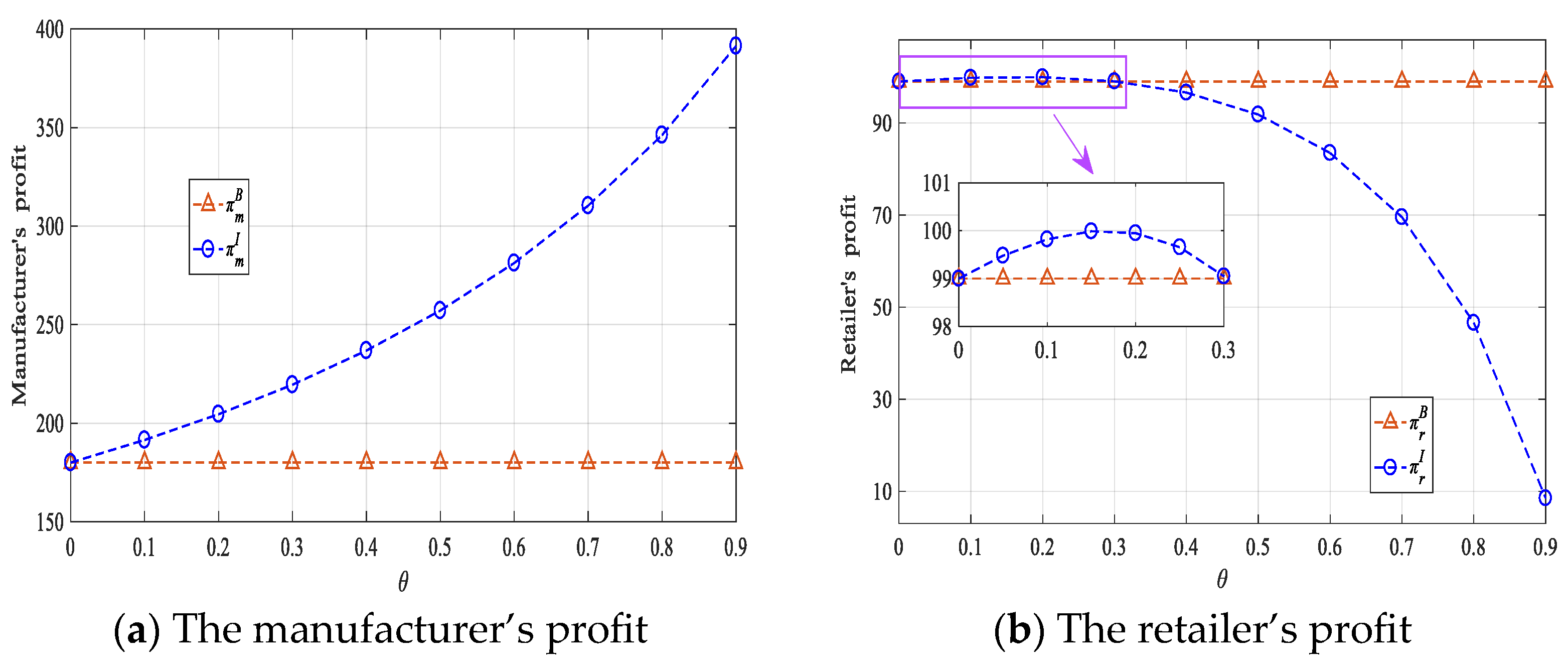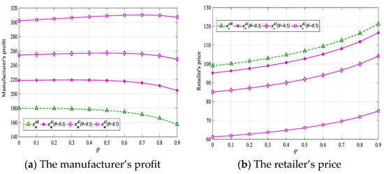 Conversely, Proposition 10(ii) finds that when the manufacturer overestimates the CSR degree, the product greenness and the wholesale price will improve. Correspondingly, the increased eco-friendliness of products encourages the downstream retailer to strengthen the marketing efforts. Nevertheless, due to the asymmetry of information, the retailer’s true CSR level at this time is lower than the manufacturer’s estimate. Therefore, in terms of pricing, the retailer will adjust the retail price upwards. Ultimately, the growth in the market demand for green products takes the dominant effect, which enhances the retailer’s profit relative to the information symmetry scenario. However, the manufacturer’s economic benefit is still reduced owing to the excessive green cost investment caused by its misjudgment. To summarize, when the retailer implements CSR, once the manufacturer cannot accurately obtain the degree information, its revenue will decline, and if overestimated, the retailer will benefit.