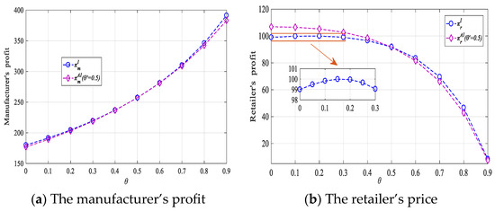 Corollary 1 shows that in the information symmetry scenario, for the supply chain in which both parties exert green efforts in their production processes, the market demand uncertainty factor positively affects product pricing and supply chain members’ economic benefits. When product sales approach the peak season, encouraged by the high scale of potential market demand, the supply chain participants will continuously improve product greenness and green marketing level. At this time, the price of the product increases due to the improvement in quality, and the downstream retailer, which is close to the consumer market, has more room to enhance price. Remarkably, despite the retailer having an advantage in the pricing strategy, under the dominant position, the demand uncertainty factor increases the marginal profit of the manufacturer more than that of the retailer; that is, . Therefore, in the cooperation of both members, the peak season is more conducive to the manufacturer’s profit.