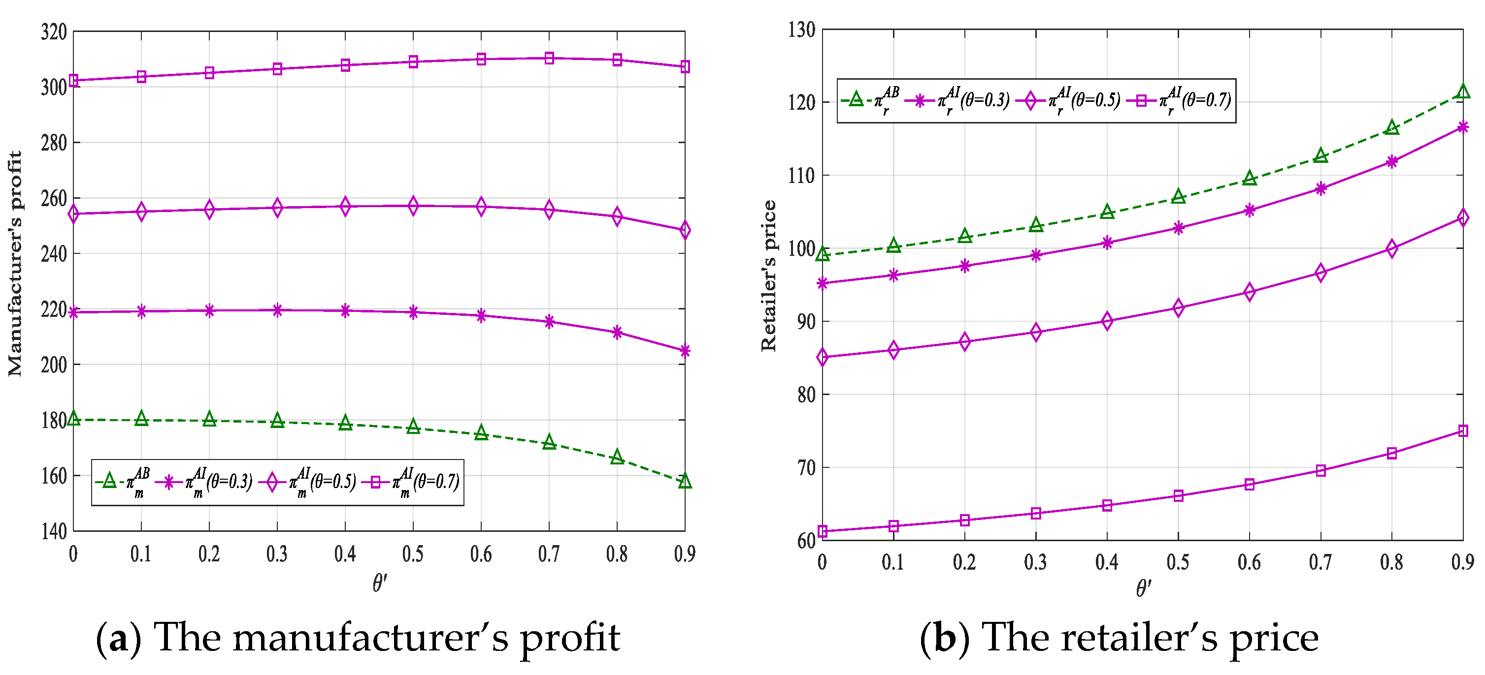 Corollary 5 shows that the change trend of decision variables with the manufacturer’s estimated CSR level in the AI scenario is the same as in the AB scenario. In particular, the rising retail price further reflects that true CSR is the driving factor motivating the retailer to lower prices for consumer benefit. Furthermore, for the manufacturer, if the true CSR level of the retailer is higher than its estimated level, that is, the manufacturer underestimates the extent of the retailer’s CSR investment, the greater the underestimation, the lower the manufacturer’s profit. Similarly, if the retailer’s true CSR level is lower than the manufacturer’s estimated level, that is, the manufacturer overestimates the retailer’s CSR investment, the greater the overestimation, and the lower the manufacturer’s profit will be accordingly. In summary, the manufacturer’s profit will be highest only if its estimated CSR level is equal to the true CSR level. For the retailer, under the joint enhancement of the price and market demand, its economic benefits and utility will improve with the increase in the manufacturer’s misjudgment degree.