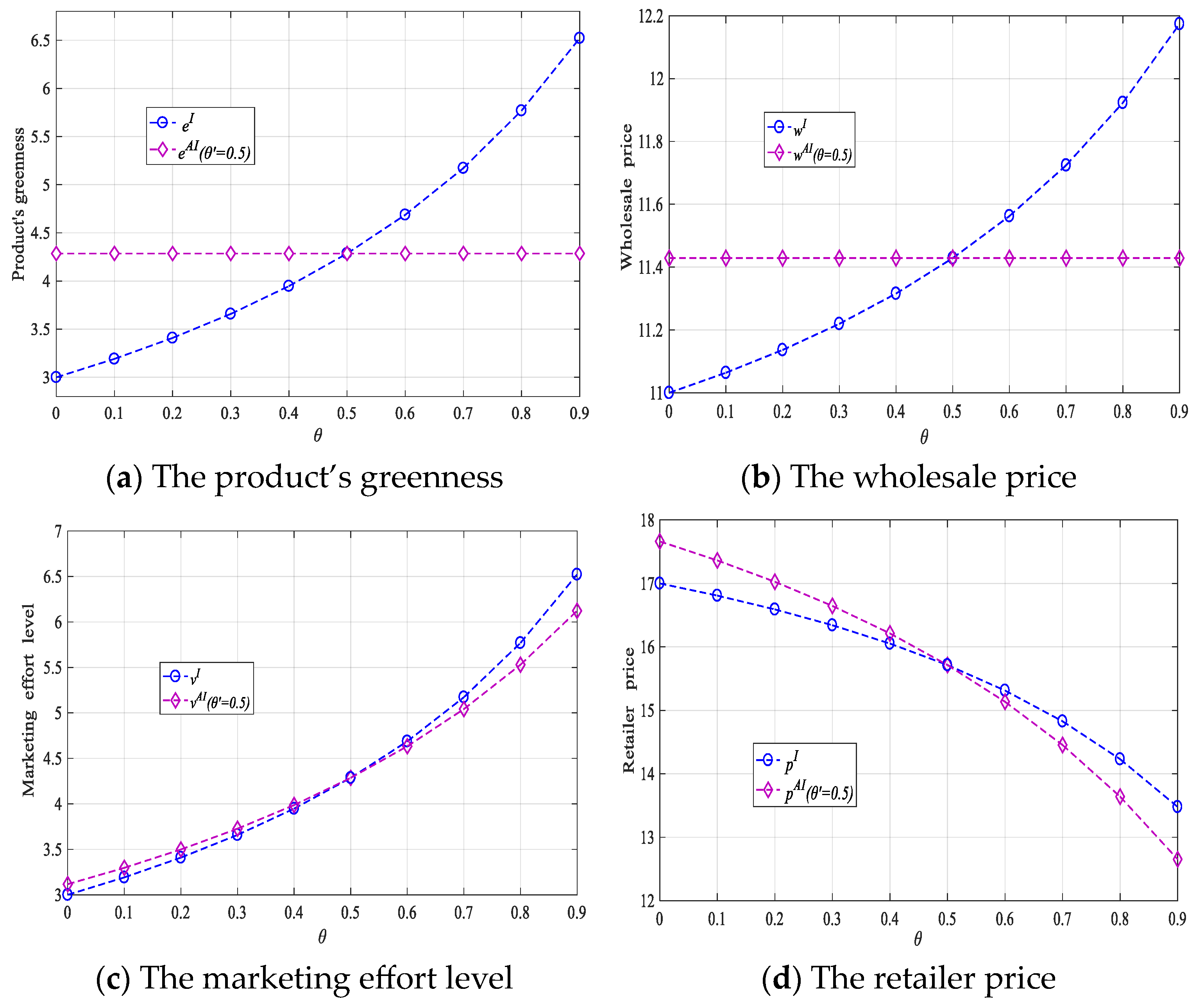 ), the product greenness, wholesale price, green marketing level, and retail price in the AI scenario are all lower than in the I scenario. The key driver behind these results is that the underestimation of the retailer’s concession induces the manufacturer to reduce its decision strength to a certain extent. At this time, since the eco-friendliness of green products does not meet the expectation of the downstream retailer, the retailer correspondingly reduces the marketing intensity to diminish green expenditure and simultaneously uses the low-price strategy to avoid excessive product demand shrinkage.