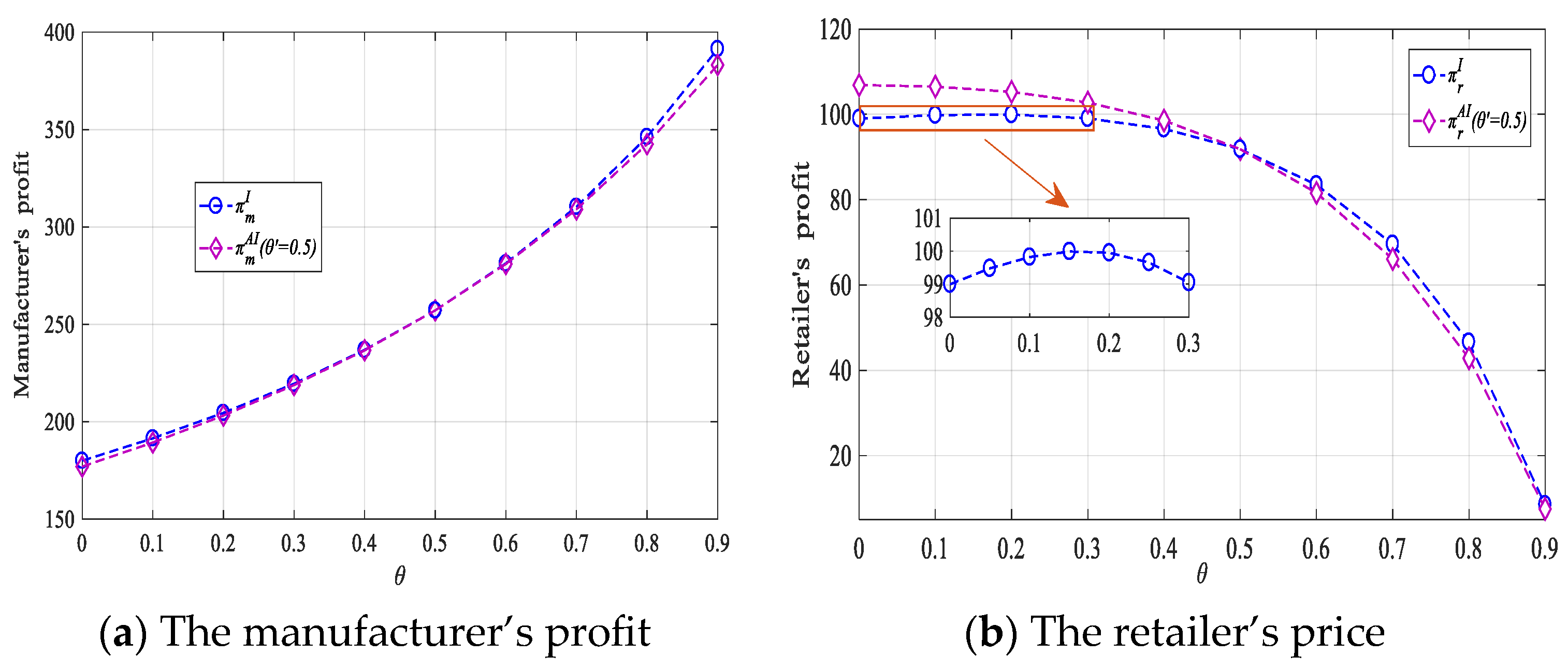 In this section, under different values of , supply chain members’ performances under the AI and I scenarios have similar change trends and relationships. Therefore, to present the conclusions more clearly, we take as an example.