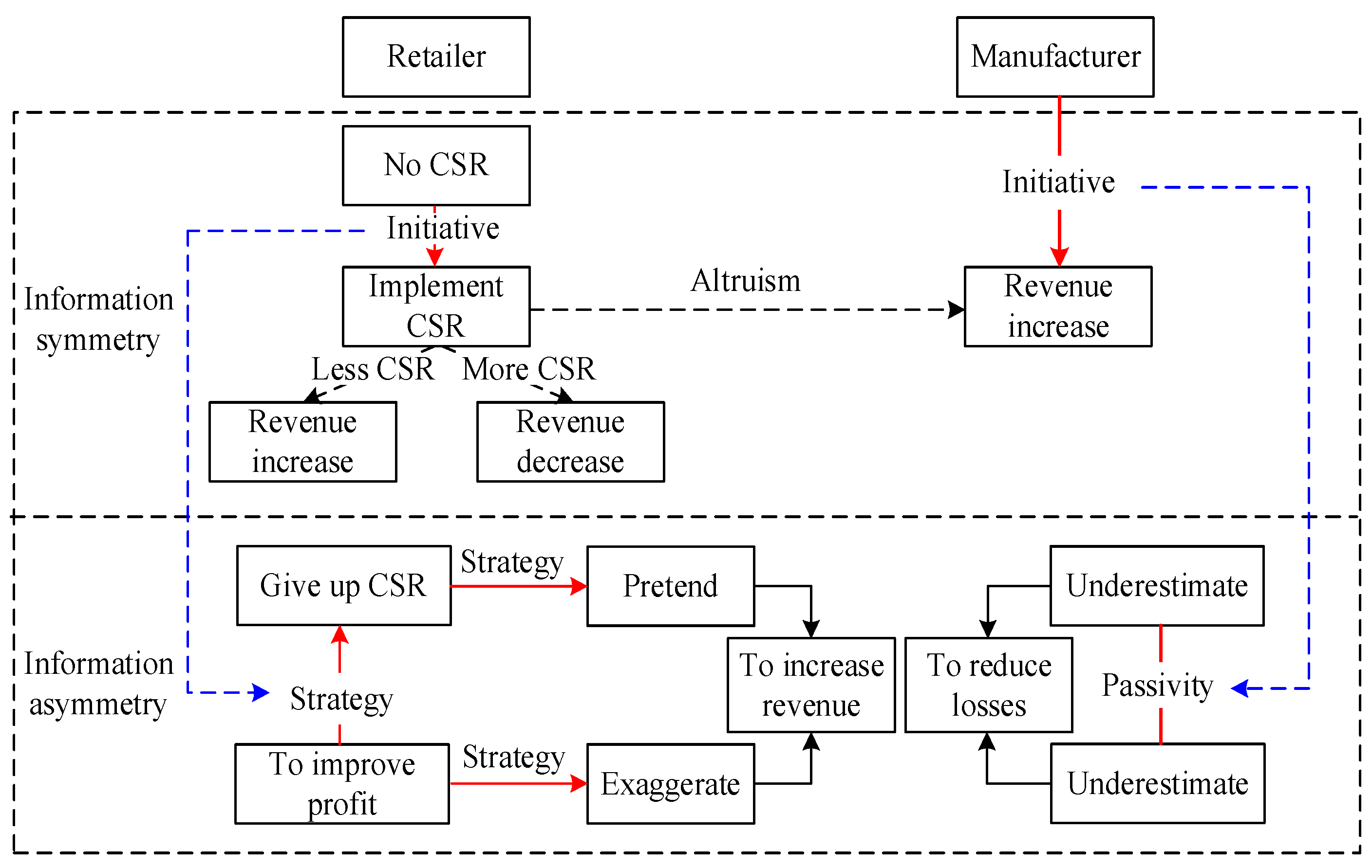 11]. Nevertheless, in practice, each supply chain member assumes different roles and pursues distinct interests, which leads to uneven levels of CSR information disclosure being prevalent. In the course of communicating information, as the information holder, CSR enterprises always occupy an advantageous position. On the contrary, as receivers of information, the stakeholders cannot ensure the authenticity and effectiveness of the information, but only further evaluate the production and operation conditions and economic performance of the enterprise through the passively received information. In addition, in the process of compiling CSR reports, insufficient qualitative description and quantitative indicators also cause stakeholders to be unable to obtain adequate information to a certain extent. Finally, in order to obtain more consumer recognition and support, and increase cooperation opportunities with the industry leader, enterprises usually exaggerate the degree of their investment in CSR, which also leads to stakeholders being unable to take their true CSR information. To sum up, the unidirectional information flow, the non-comprehensive and standardized basis of compiling reports, and the dissemination of misleading information collectively contribute to CSR information asymmetry in supply chains, which also affects the supply chain members’ operational performance.