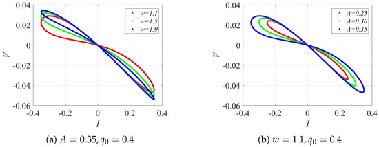 As shown in Figure 1, the hysteresis curve of the proposed memristor exhibits a characteristic figure-eight shape at the origin, consistent with the fundamental definition of a memristor. The voltage across the memristor depends not only on the instantaneous current but also on the accumulated charge, reflecting its inherent memory effect. Moreover, the shape and area of the hysteresis loop vary with the input signal and internal parameters, confirming that the model accurately captures the nonlinear and history-dependent dynamics of the memristor.