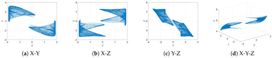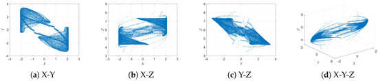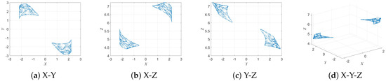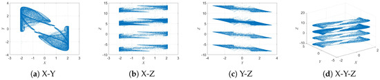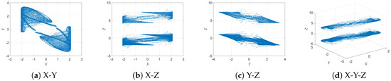 When parameter b is further increased to , as shown in Figure 7, the system displays four independent and disconnected attractors in the and planes, with all four maintaining similar geometric structures. This gradual evolution from a single attractor to multiple echo attractors reveals the complex bifurcation behavior of the 3D-DEMM and its strong sensitivity to parameter variations.
