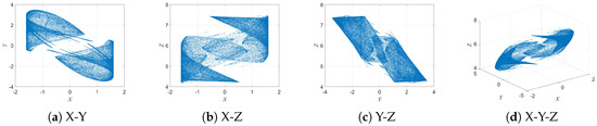 Figure 8 illustrates the formation of coexisting attractors in the 3D-DEMM system. Specifically, Figure 8a shows the attractor patterns under different initial values of (), where it can be observed that the system evolves into different attractor regions depending on the initial conditions, exhibiting multiple coexisting dynamic behaviors.