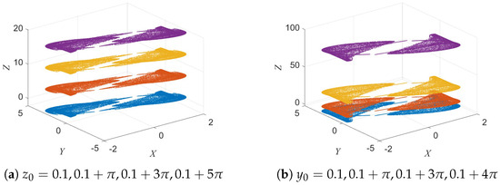In nonlinear dynamic systems, coexisting attractors refer to the phenomenon where, under the same parameter conditions, the system may evolve into different attractor regions depending on the initial states, thereby exhibiting multiple dynamic behaviors simultaneously. In this section, the potential coexisting attractors of the 3D-DEMM system are analyzed to reveal its dynamic diversity. The initial conditions are set as , , and , with parameters and . By varying the initial values of and , the attractor patterns of the 3D-DEMM are observed. The results are illustrated in Figure 8.