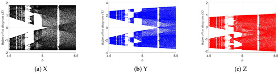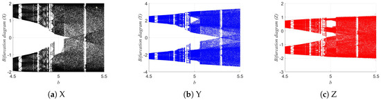 To investigate the dynamic evolution characteristics of the 3D-DEMM system, this section analyzes the system’s behavior under different parameter conditions using bifurcation diagrams. Bifurcation diagrams are an intuitive and effective tool for illustrating how the system transitions among stable states, periodic orbits, quasi-periodic orbits, and chaotic behavior as the parameters vary. The results of the bifurcation diagram analysis are shown in Figure 9, Figure 10 and Figure 11.