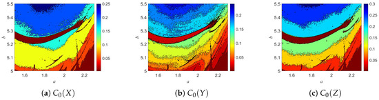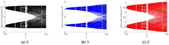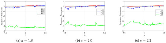 The Lyapunov exponents (LEs) of the 3D-DEMM were analyzed. The Lyapunov exponent is an important indicator for measuring a dynamic system’s sensitivity to initial conditions, reflecting whether system trajectories diverge or converge exponentially over time. If the system has a positive maximum Lyapunov exponent, it indicates typical chaotic behavior. The Lyapunov exponent analysis of the 3D-DEMM is shown in Figure 12. The value of b ranges from 4.5 to 5.5, with an iteration step size of .