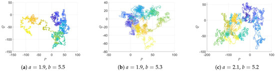 By analyzing the regular attractors of the 3D-DEMM system, the evolutionary characteristics of the trajectories in phase space can be clearly observed. As shown in Figure 2, Figure 3 and Figure 4, under the initial conditions , , and , the system states gradually converge to a specific trajectory region over time, forming a stable attractor structure. As the parameters (a and b) vary, the shape of the attractor changes accordingly, reflecting the diversity of the 3D-DEMM dynamics.