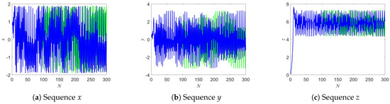 To examine the initial value sensitivity, a tiny perturbation is added to the initial condition of x, i.e., . The evolution of the three sequences under this perturbation is shown in Figure 14, illustrating the high sensitivity of the system to initial conditions, which is a hallmark of chaotic behavior.