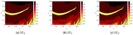 provides a measure of the complexity and unpredictability of a signal by quantifying the distribution of its frequency components. Chaotic signals typically exhibit high uncertainty and complexity, characterized by a broad frequency spectrum and a relatively uniform energy distribution. These properties result in higher values, which reflect the richness and randomness of the signal’s frequency content. Therefore, serves as an effective tool for revealing the dynamic behavior and complexity of signals, particularly for chaotic systems. The results of the SE complexity analysis are presented in Figure 16.