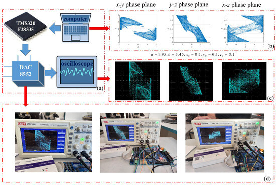 The experimental process of implementing the proposed chaotic system on the DSP platform is illustrated in Figure 18a, which provides a complete depiction of the signal flow and hardware interconnections. During the experiment, the system parameters were configured as , , with initial conditions , , and . Under these settings, the DSP performed real-time iterative computations of the chaotic map, and the generated voltage signals were converted into analog waveforms through the DAC module.