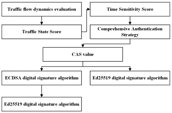 Considering the variability of IoV under different traffic flow conditions, safety message authentication schemes must consider safety, efficiency, and adaptability. To address these requirements, this paper proposes an Adaptive Traffic Authentication Strategy (ATAS), which combines the security and efficiency advantages of the Elliptic Curve Digital Signature Algorithm (ECDSA) [43] and Edwards-curve Digital Signature Algorithm (EdDSA) [44] with the dynamic characteristics of IoV, taking into account the dynamic changes in traffic flow. ATAS intelligently selects the most appropriate digital signature algorithm by analyzing real-time traffic flow data, e.g., vehicle count, average speed, and detector occupancy, allowing it to adjust the authentication process dynamically. This ensures optimal efficiency and response speed, providing an efficient, reliable, and adaptable solution for safety authentication while maintaining acceptable safety levels.