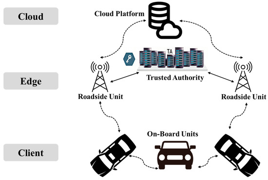 Edge computing is a distributed computing architecture that transfers data processing tasks from central servers to clients at the edge of the network, that is, close to the location where data is generated or collected, which can significantly reduce data transmission delays and improve response speed and system efficiency [31]. After a large amount of data is processed locally, only part of the necessary information needs to be sent to the central server, thereby easing the pressure on the central cloud server, improving bandwidth utilization, and enhancing data security and privacy protection [32]. Edge computing has become an ideal choice for applications with high real-time data processing requirements, such as the Internet of Things, smart cities, and autonomous vehicles [33,34,35,36]. Cui, Wei [37] proposed a security privacy protection authentication scheme that incorporates edge computing concepts to the message authentication process of vehicular ad hoc networks (VANETs). Subsequently, Cui, Zhang [38] proposed a secure vehicle network authentication scheme using a cloud broker (CB) as an intermediary in a multi-cloud environment. They proposed a new vehicle network architecture suitable for a multi-cloud environment. The CB, managed by a trusted authority (TA), selects a suitable cloud service provider (CSP) for the vehicle. To address the authentication challenge in a multi-cloud environment, Zhang, Zhong [39] proposed a many-to-many authentication and key agreement scheme between vehicles and CSPs. This approach ensures data security and user privacy by establishing session keys in multi-party mutual authentication.