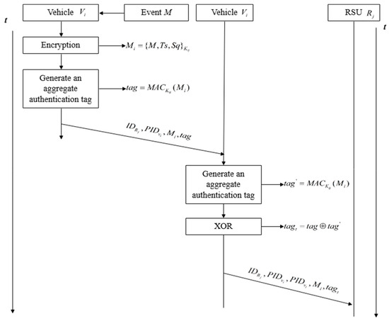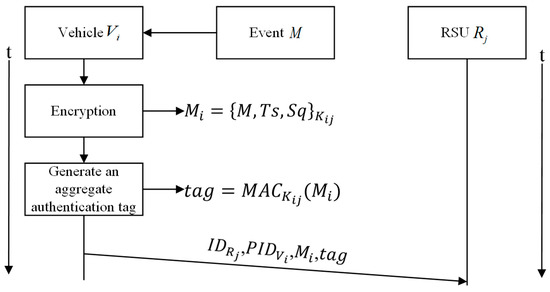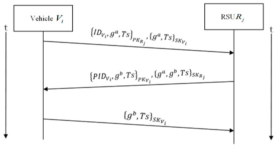 When the vehicle enters the communication range of an , both parties initiate the process to establish a shared key. This process utilizes the Diffie-Hellman key exchange protocol [45] for mutual authentication and shared key establishment, as illustrated in Figure 3.