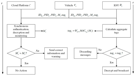 (2) In the security message transmission and authentication scheme based on the cloud-edge-client collaborative architecture, this paper utilizes cloud platform C to authenticate and decrypt the received messages synchronously and monitor the RSU to ensure the correctness and integrity of the RSU’s broadcast messages. However, in real IoV scenarios, the cost is relatively high. Future research could consider using some slow-moving vehicles to replace the functions of the cloud platform or RSU, under the premise of ensuring safety, improving the efficiency of information transmission, reducing the operating costs of the vehicle network, and strengthening the practical recommendations.