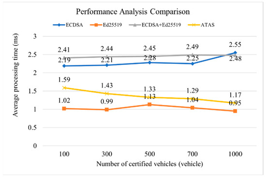 For lower CAS values, indicating a lower current security message authentication load within the IoV, more computational resources are available. In such cases, a more complex but secure authentication method, combining the ECDSA digital signature algorithm with the Ed25519 digital signature algorithm, may be selected. For higher CAS values, indicating a larger current security message authentication load and fewer available resources, the system may opt for a simpler authentication method using only the Ed25519 digital signature algorithm. The algorithm is suitable for high traffic flow and high time sensitivity scenarios.
