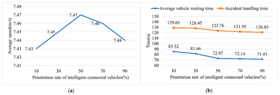 Traffic parameters under different penetration rates of connected vehicles. (a) average speed and (b) average vehicle waiting time and accident handling time.
