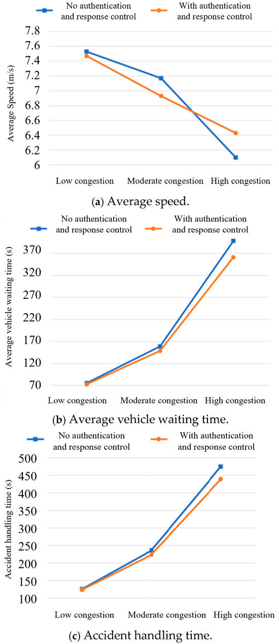 Examining different congestion scenarios allowed us to demonstrate the adaptability and efficiency of traffic response strategies during peak and off-peak hours under the proposed authentication system. This analysis facilitates the study of optimizing information transmission and accident response strategies across varying traffic densities. In the simulation, traffic flow parameters were configured to represent various traffic environments in the real world, ranging from low to high congestion. The definitions of low, moderate, and high congestion are provided in Table 5.