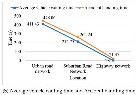 The highway network has the highest average vehicle speed, reaching 18.03 m/s, the average waiting time is only 1.28 s, and the accident handling time is 21.47 s. This shows that the traffic flow on the highway section is extremely high, the vehicle speed is fast, and the vehicle waiting time and accident handling time are very short. However, the high speed of the highway will also increase the risk and severity of accidents. We can strengthen the construction of smart highways, predict and warn possible accidents, reduce the accident rate and mitigate the consequences of accidents.