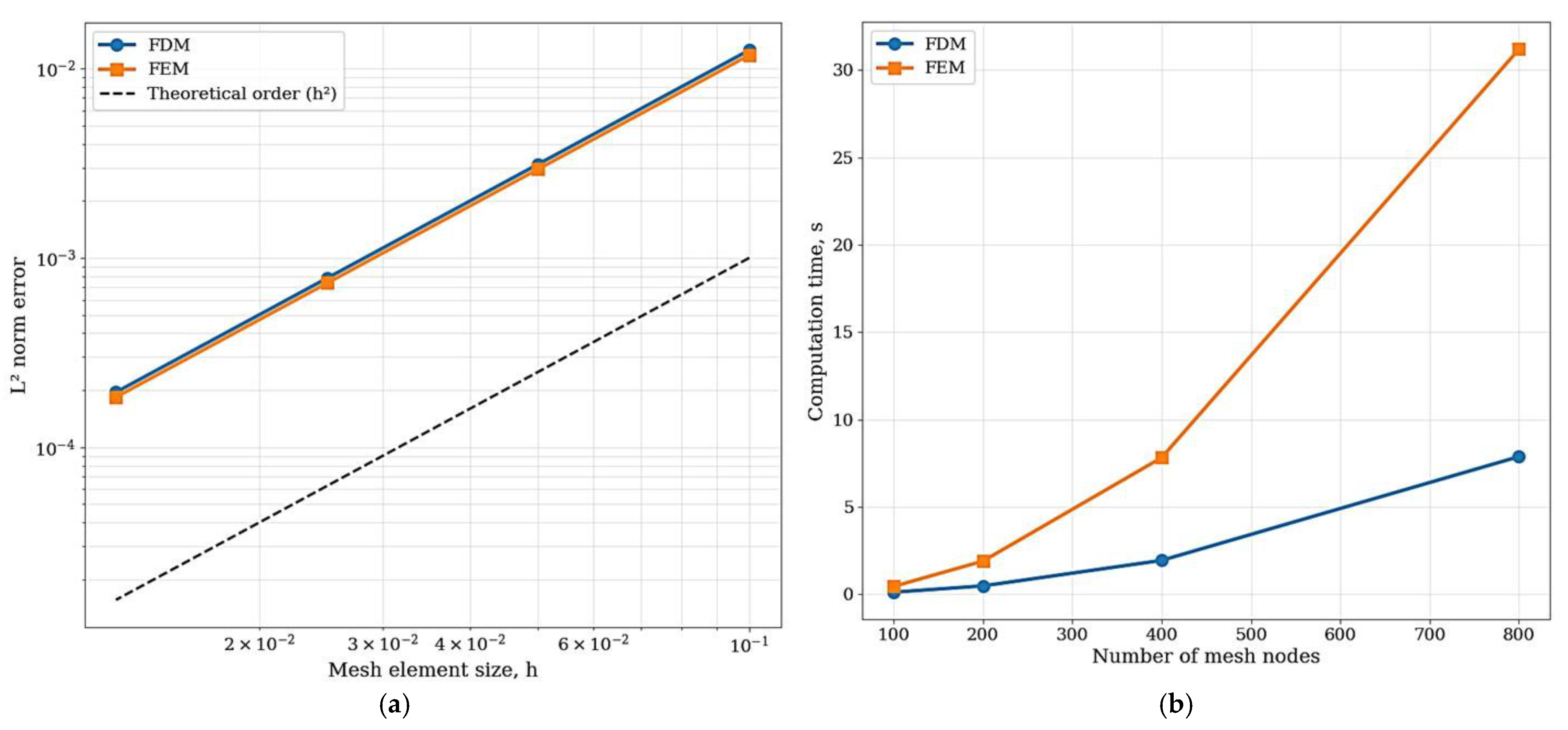 Section 5) showed that both methods exhibited a second order of accuracy with respect to space, which corresponds to the chosen approximation schemes: the second-order central differences in the FDM and the quadratic basis functions in the FEM. This is consistent with theoretical expectations for these types of sampling [