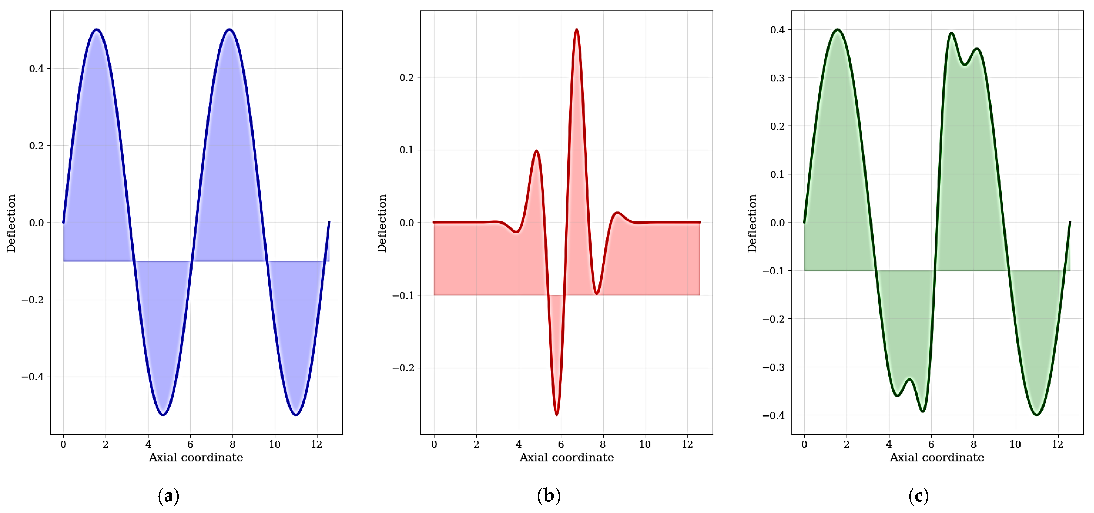 Figure 6a) is characterized by a smooth curvature of the bellows axis as a whole, similar to the longitudinal bending of a rod. This shape typically dominates over short bellows with a small number of corrugations. The local shape (